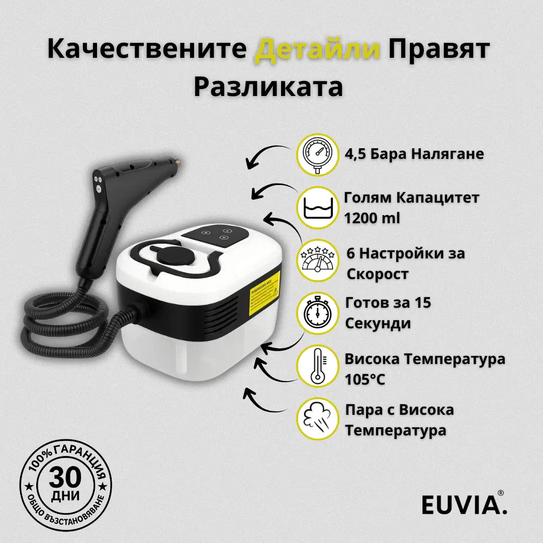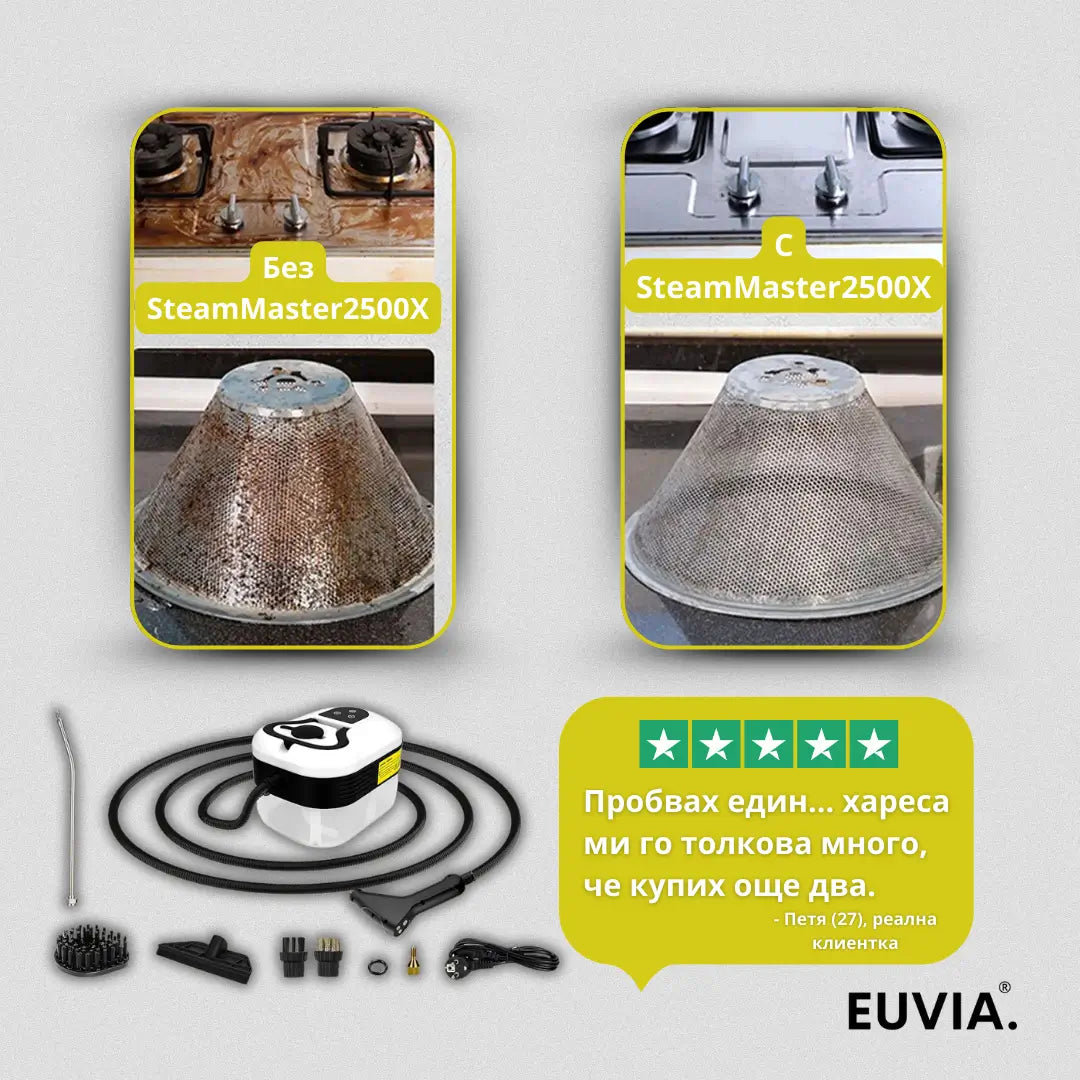 Знаем колко frustриращо е — упоритите петна и остатъци могат да бъдат изтощителни. Ето защо SteamMaster2500X™ идва с 30-дневна гаранция без риск! Ако не ви помогне да премахнете петна и остатъци бързо и без усилие, ще ви върнем парите — без въпроси. Уверени сме, че ще харесате резултатите: чисти повърхности, искряща чистота и лесно почистване, което се вписва перфектно във вашия натоварен ден.